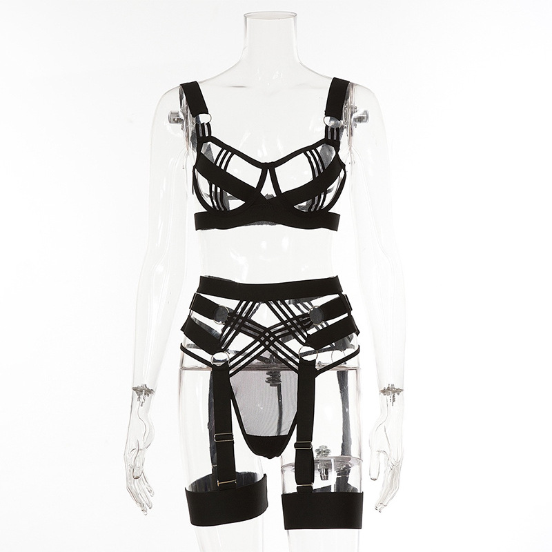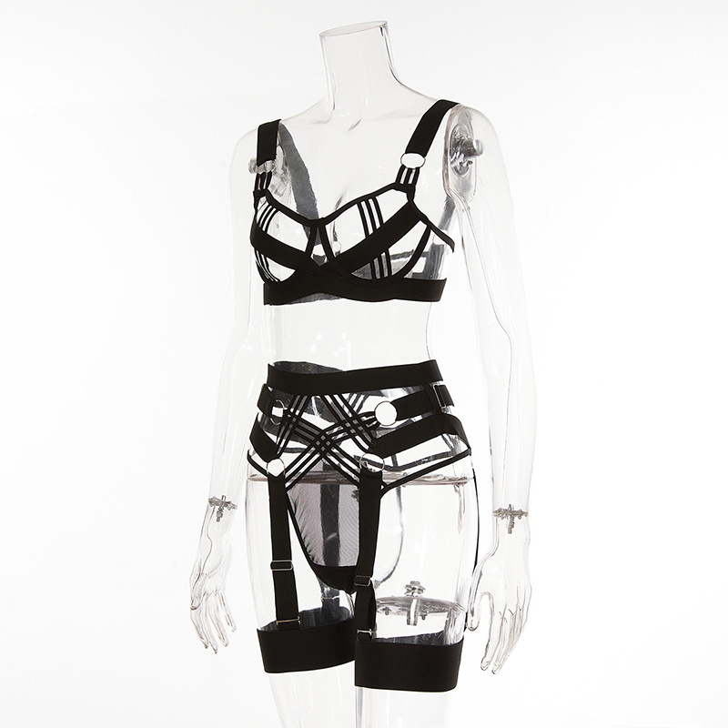 Black Hollowed-out Lingerie Set With Straps For Women